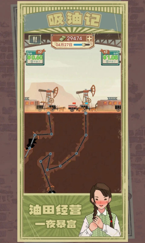 吸油记2024最新版以上世纪七八十年代为背景,以开采石油为题材,画风充满经典怀旧气息,玩家化身石油经理,经营一家石油开采公司,需要安排工人进行石油探索、开采、运输等一系列流程,做大做强石油生意,获得更多奖励,成为著名的石油大王。