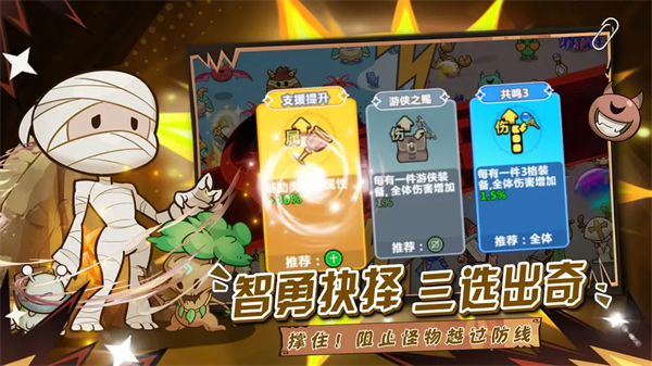 玩家以上帝视角指挥各勇士战斗,每个战斗画面都看得清清楚楚,观察战斗局势和敌人战斗动作,为各个勇士随机进行技能增益。