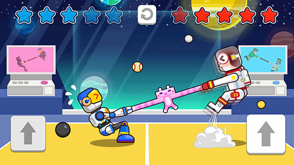双人口袋大作战无广告版本的横屏画面使游戏细节更加清晰,它是由两名玩家一对一竞技PK,游戏首页还设置了多款小游戏,其中就有最经典的拔河比赛,只要一方将另一方拉过地面的白线就算获胜,是一款适合休闲解压的小游戏。