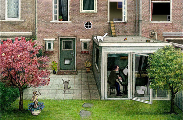 12.用遥控器打开窗台的雨棚,让猫爬上右边的树。
