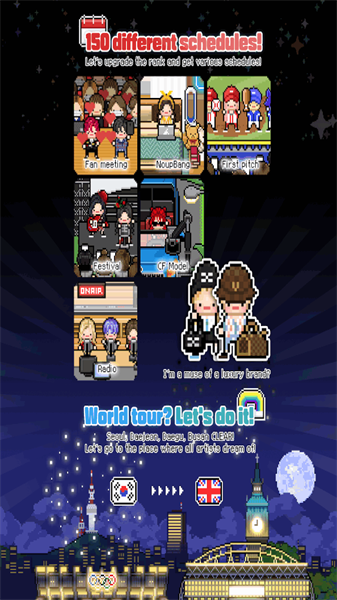 月刊偶像2汉化版中作为一个经纪人,带领自己的艺人来举行巡回演出和粉丝见面会来维持人气是你最主要的工作吗,当然来接一些综艺上的通告和影视上的客串也是十分不错的机会,这一切都依靠你的决定,让你的艺人长久的人气爆棚下去吧