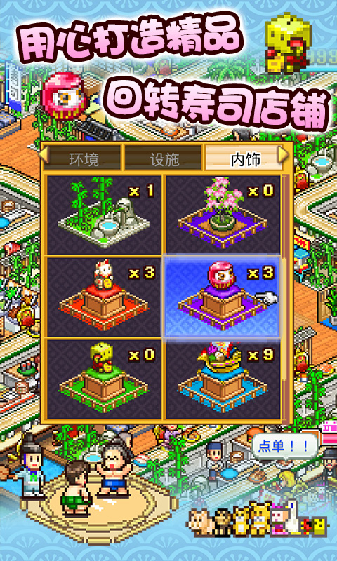 海鲜寿司物语这款游戏玩起来非常不错,玩家可以把自己的寿司店铺进行装修,还可以给店铺里面添加一些各式各样的家具,让店铺的整体看起来会提高一个档次,这样还会拥有更多的客人,客人越多,玩家赚取的金币就越多。