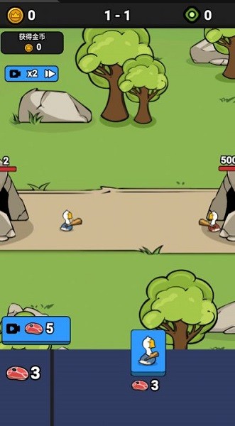 3、接着先让扔石头的鹅先出击,利用远程优势攻击对手,不费一兵一卒就能干掉对面的鹅。