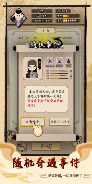 闯荡江湖的时候会遇到很多随机事件,不仅要求玩家要有强大的技能,还要有聪明的头脑才可以顺利解决。