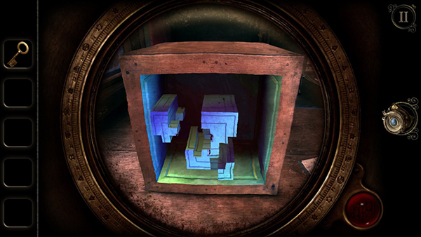 12、组合完成后,盒子上会出现钥匙孔,将左侧物品栏上的小钥匙拖到钥匙孔上,转动钥匙,盒子就打开了