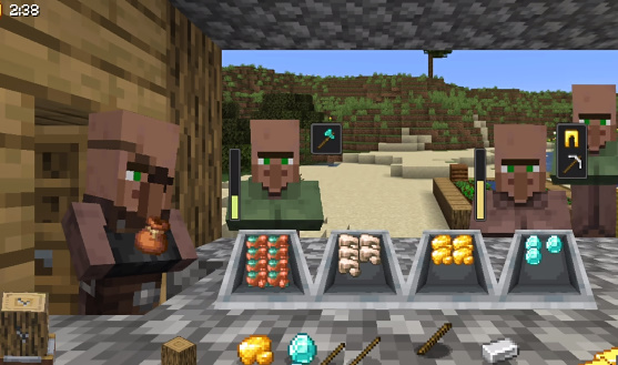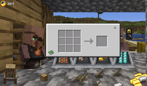 4、这时候玩家就可以用右下角的工作台来组装成各种物品,提供给村民就能赚绿宝石了。