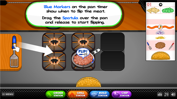 1、下载完成后进入游戏后,制作塔克的第一步就是煎肉。