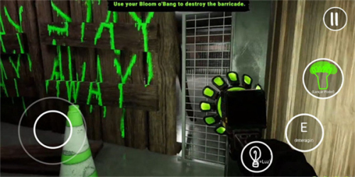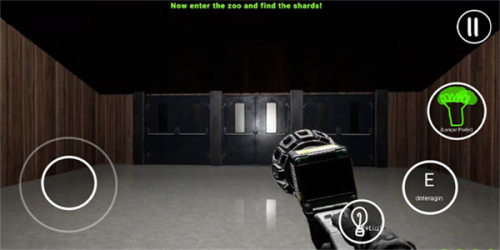 2.点击play进入游戏,在主界面,左侧是虚拟键控制前后左右移动,右侧则E表示射击开门,靠左边的是换灯具,照亮,最上面的是抓取碎片