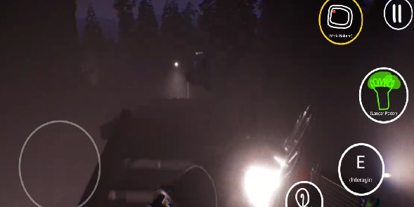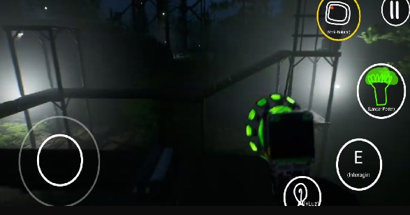 点击play进入游戏,在主界面,左侧是虚拟键控制前后左右移动,右侧则E表示射击开门,靠左边的是换灯具,照亮,最上面的是抓取碎片