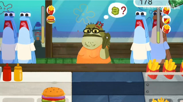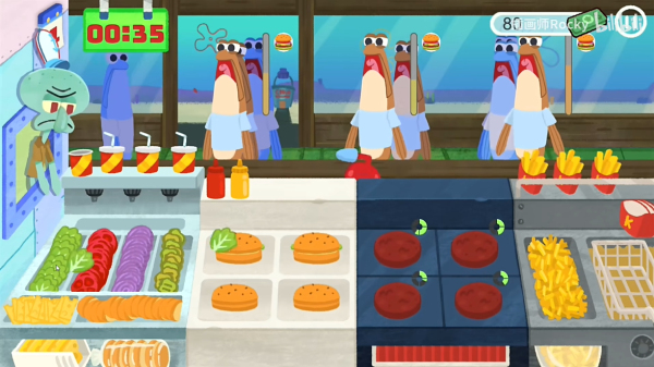4、煎制肉饼,将肉饼夹入汉堡中,完成后即可交给顾客。利用蟹老板的爪子收集金币。