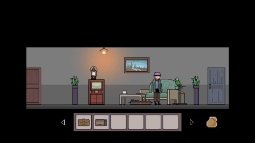 然后从卧室出门,来到客厅,客厅从左到右有一台电视机,电视机上有煤油灯(重要道具),然后是桌子,桌子上有咖啡和报纸(剧情介绍),桌子后面挡住的就是行李箱,然后是沙发,到鹦鹉,在最右边就是浴室(如果你没有点击行李箱,是不能够进到浴室里的)