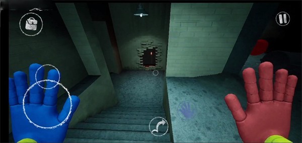 3、醒来出现在一个陌生的世界,这里有很多玩具,左下角按钮可以操纵角色自由移动,右侧代表左右手掌,便于拾取物品,目前只能使用绿色手掌。