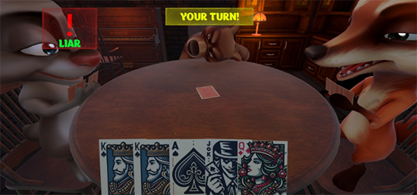 骗子酒馆是一款策略角色扮演类手游,你作为一名酒馆里的客人,需要在游戏里和其他三个角色一起玩牌,然后通过质疑来揭穿其他玩家是否在撒谎。游戏为我们的玩家提供了四个不同的角色来进行选择,我们可以通过联机的方式来和其他的玩家一起同台竞技。游戏将为我们的玩家提供K、Q、A以及小丑牌四种不同的牌型,我们可以运用自己超人的智慧揭穿撒谎的玩家。