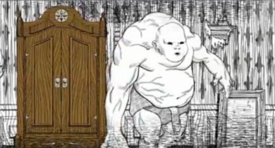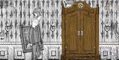 5.在一个小门里他看到一幅画像,一个男人握着骷髅坐在椅子上以厚嘴唇和一些非洲特征为特点。回到大厅他遇到了封闭的大门,通向黑暗。经过的第一个房间里有很多油漆涂满的娃娃,可能是他女儿的房间。走向更黑暗的走廊,地板上有窗外月光的影子。