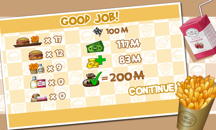 3. 随着游戏的进行,解锁更多种类的汉堡和其他零食,如炸薯条和奶昔,以满足不同客户的需求。