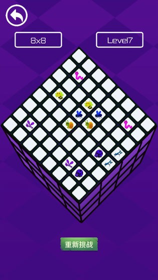 在此魔方连连看中,找到两个相同的正方形,单击并消除它们。