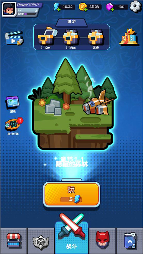 2、通关后玩家将解锁商店、英雄和升级功能,玩家可利用游戏获得的钻石在商店中购买升级需要的材料;