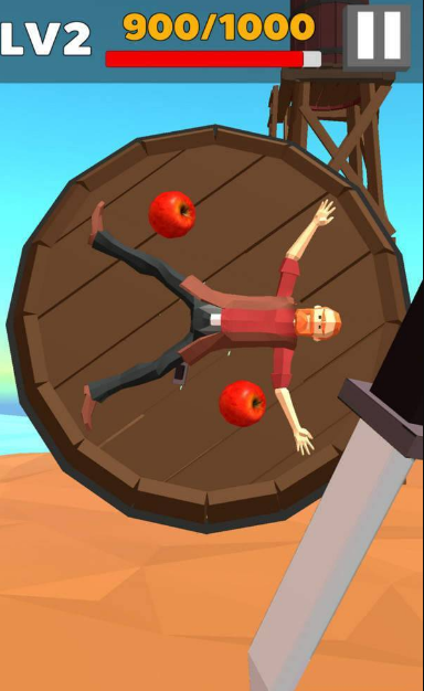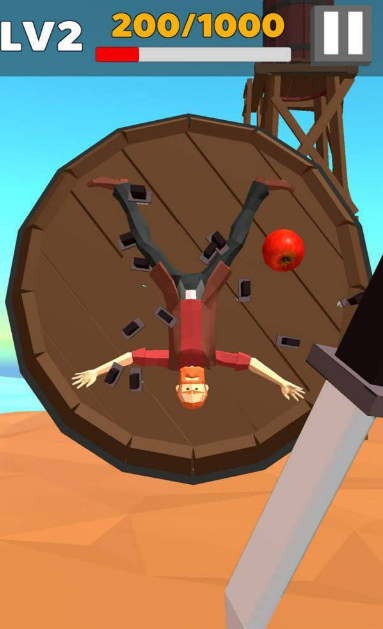 使用飞刀击碎苹果的时候要小心旁边的小人。