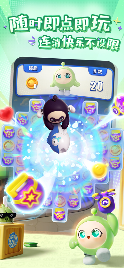 游戏玩法:经典的三消玩法,玩家需要通过消除相同的方块来完成关卡目标。