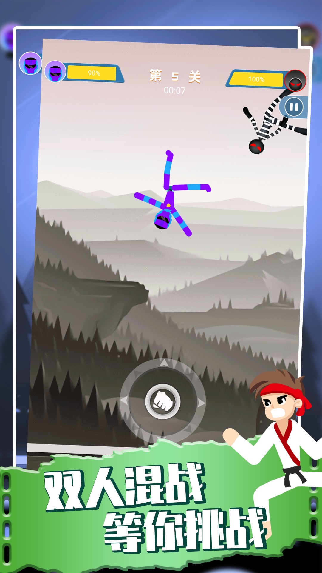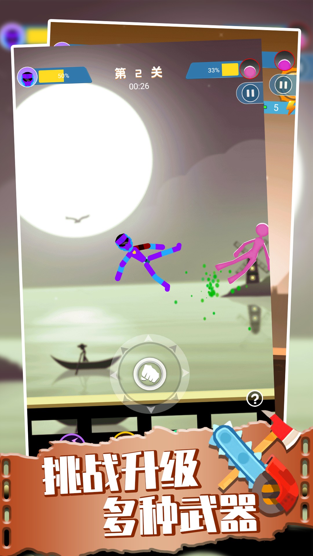 超高人气的火柴人格斗动作游戏,玩家操控火柴人进行冒险之旅,将面前的所有对手全部击败,即可获得最后的胜利,只要你的敌人在你的攻击范围内,你就会比他们更快地杀死他们。