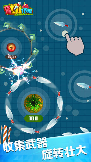 1、操纵水果吸附周飞散落的飞刀,形成飞刀防护壁,用来保护和攻击对手。