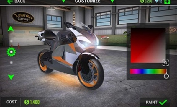 3.自定义摩托车:玩家可以自定义自己的摩托车,包括车型、颜色以及各种性能配件,打造独一无二的赛车。