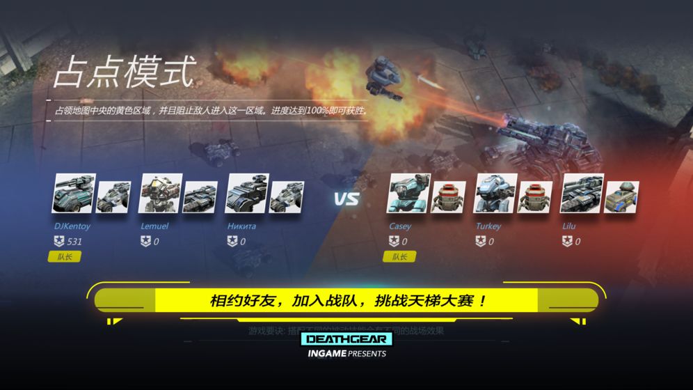 组队死战模式:与队友配合作战,击杀数率先达到25次的一方获得最终胜利。