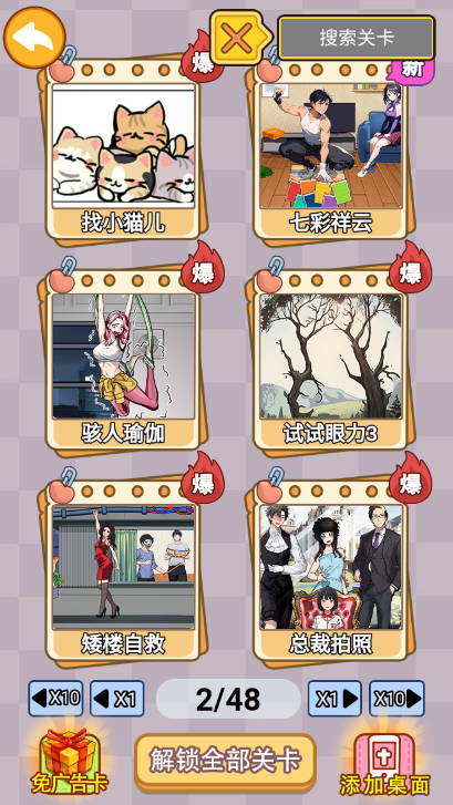 1、游戏中拥有众多关卡供你选择,不用观看广告即可解锁各种提示,帮助你顺利的通关。