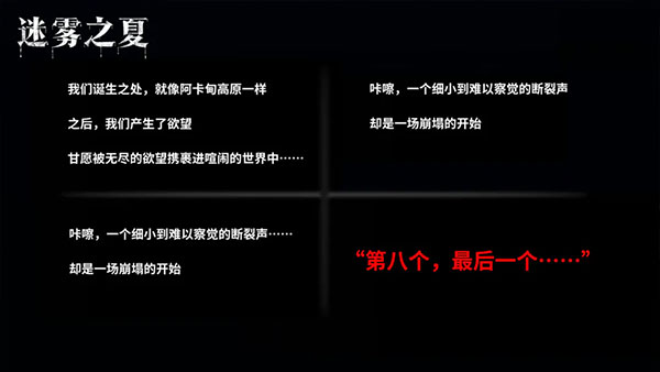 迷雾之夏官网版是一款充满推理与冒险的文字AVG游戏。它将带你深入剧情,体验一段扣人心弦的推理冒险之旅。在这个充满神秘和未知的夏日迷雾中,你将运用智慧和勇气,揭开隐藏在其中的真相。快来加入迷雾之夏官网版的世界吧!展开你的推理冒险之旅!