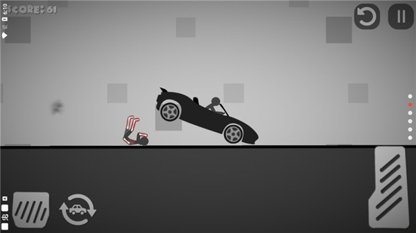 3、活用按钮,左边的按钮是让车减速或者后退的,右边长条的按钮是加速前进的,而有汽车标志的是让车重新从空中落下的,反复使用这三个按钮可以让火柴人受伤更多: