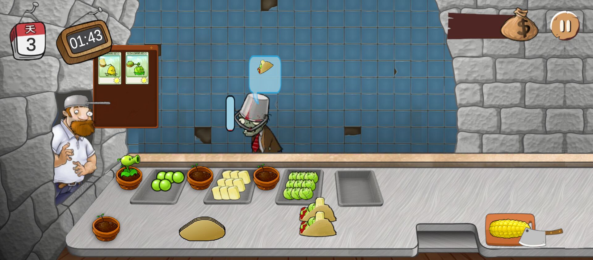 4、随着关卡的推进,玩家可以解锁更多食材和武器,提升自己的防守能力,迎接更加强大的僵尸敌人。