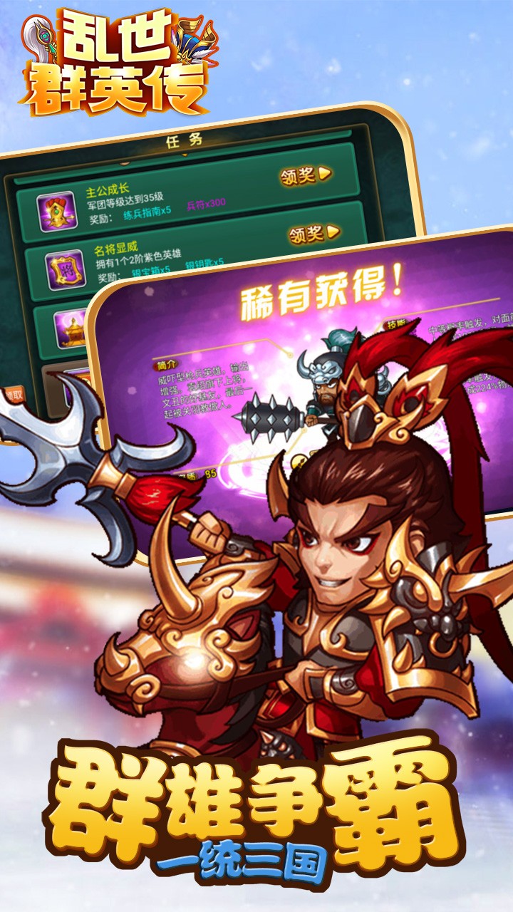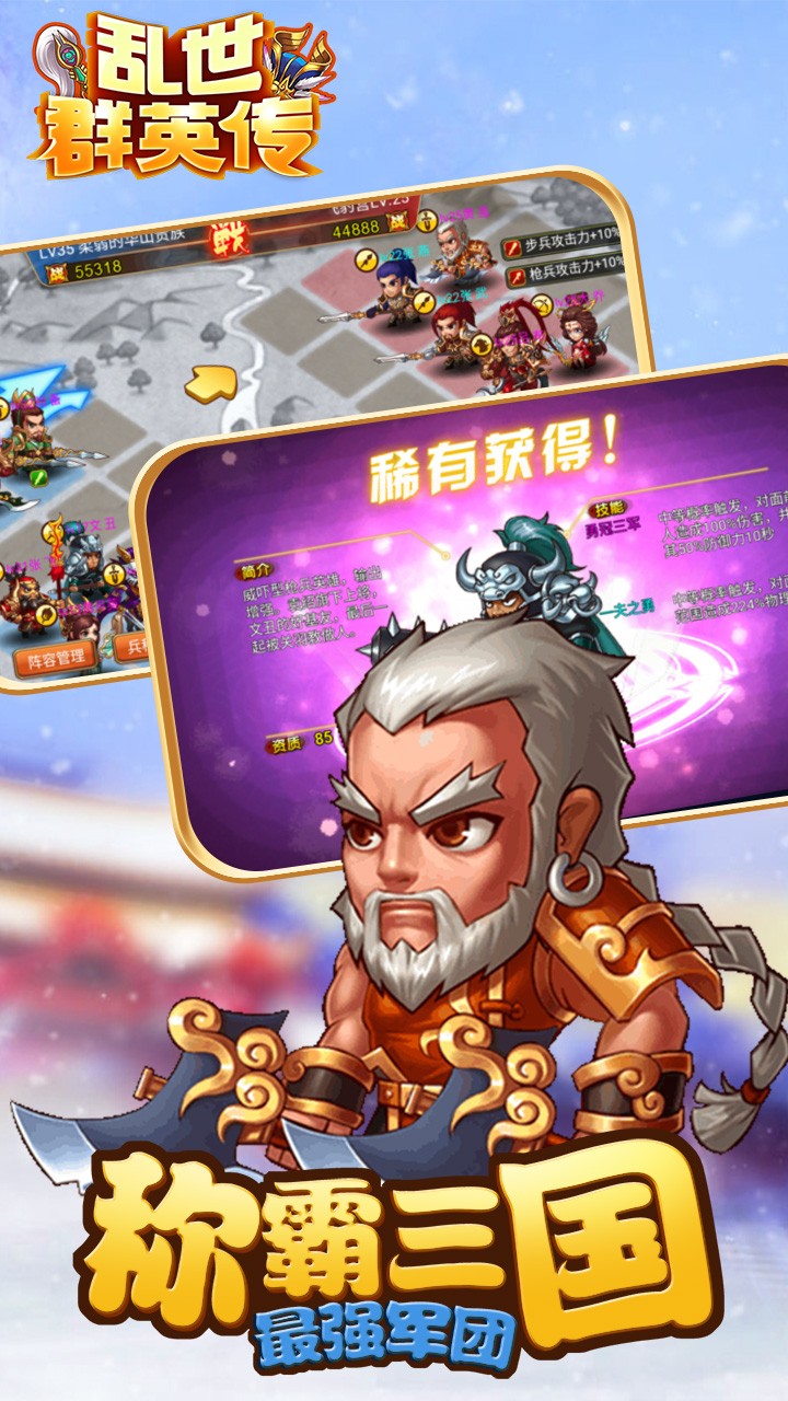 《乱世群英传》是一款全新的Q版策略性卡牌型游戏,游戏根据真实的经典三国历史题材改编,采用可爱Q版中国风的精美游戏画面,游戏以Q版武将形象和简单的操作为大家再次描绘一个和记忆中完全不一样的三国时代!《乱世群英传》用创新的阵容战斗玩法,让玩家体验真正策略性的卡牌游戏的独特魅力。《乱世群英传》的故事背景是情侣在穿越的过程中发生意外从而导致情侣走散,整个剧情围绕着主角寻找情侣展开而发生的奇遇故事!这款游戏采用真正意义上的开放式玩法,解放了玩家的双手,离线挂机的方式让玩家体验轻松的战斗!不需要动手的战斗也能带来最大的快乐!百变的游戏造型,多样的服装自由搭配,最强阵容等待你自由搭配!