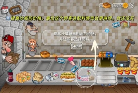 4、最后要升级的是糖浆、自定义卷饼口味、薯条包装这三类,这三类升级需要玩家自己手动操作,而且比较麻烦,尤其是自定义卷饼口味,需要注意顾客要求的卷饼口味,非常麻烦,推荐最后攒好金币一次性升级完。