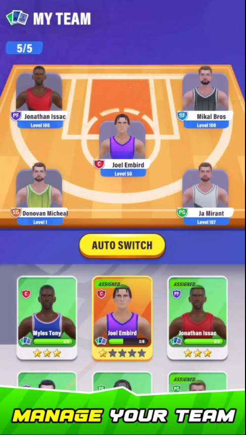 3、众多的篮球角色:在游戏中为自己特训篮球队员,特训篮球队员,帮助他们提高综合实力,将他们带入比赛中。