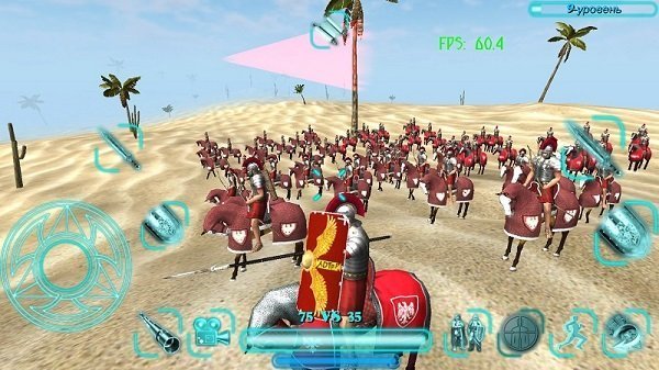 5、进度条右边的第一个按钮可以选择士兵的战斗阵型,不过兵力少时这个没什么用。我们的角色则是通过左下角的方向按钮控制移动,屏幕上有剑的按钮是攻击按钮,盾牌的是防御按钮,手指在屏幕上滑动来调整我们的视野。