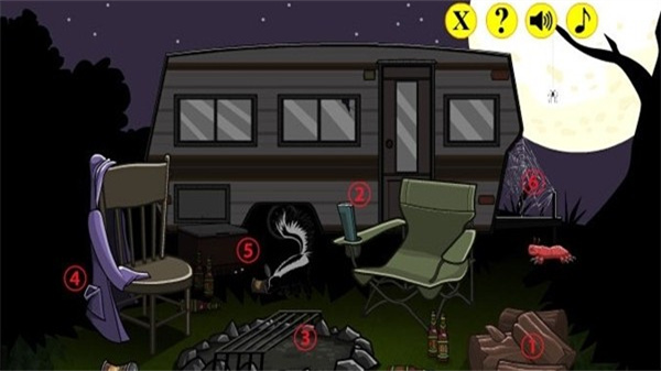 场景2:将木头和椅子上的绿色物体放进火堆里,从衣服口袋取出打火机,点燃柴火,将臭鼬吃的垃圾罐放到蜘蛛网上,蜘蛛下来吃苍蝇,吃掉蜘蛛,点击左边的易拉罐放到火上,再将臭鼬缠住。点击臭鼬。点击汽车上坏的玻璃,进入场景3;