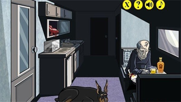 场景3:吃掉桌上养殖缸里的蝎子,这时候点击哪里狗都会叫,点击橱柜门,将热狗丢到地上,主人便以为是狗干的,将其撵出去。到窗外将狗吃掉,再回到屋里,点脏碗碟,点击顶端的柜子取出红色的罐子,点击香烟,取打火机点火,这时候就可以干掉老头了,他老婆会从门里开枪射击,两枪后就要逃出窗外,否则就死了;