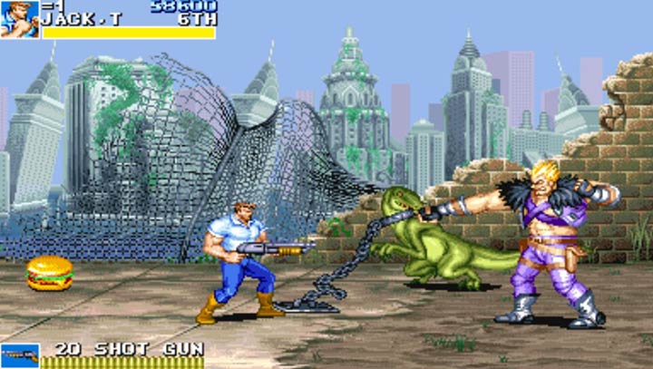 《恐龙快打》(Cadillacs and Dinosaurs)它是由日本CAPCOM公司出品的。游戏改编自1993年美国CBS放送的《Xenozoic Tales》 ,靠经典商业题材--“恐龙”来卖座。舞台设定在恐龙和人类共存的26世纪。在此作品中,道具的作用得到了很大的强化,所有的武器械道具都有弹药的概念,弹药用完就只能作为一次性的投掷道具了,甚至可以抢到Boss的武器来反制。像木桶一类的容器道具不再是仅仅为得到其中的物品被砸破了,它们可以被抬起投掷出去。 除此之外,《恐龙快打》也继承了Capcom惯例的多种攻击方式。游戏也中有很多值得玩味的Bug,是一部不失水准的热斗之作。