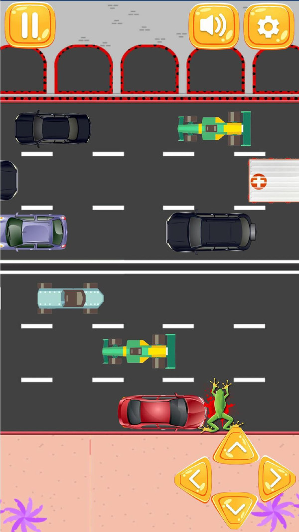 *通过点击按钮来控制青蛙的方向,灵活地躲避各种危险,保持生命力,不断前进。