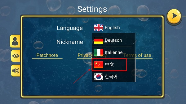 2、进入“Settings”界面-->点击“English”,弹出“语言”菜单-->滑动菜单,点击“中文”-->点击右上角“▶”即可设置为中文。
