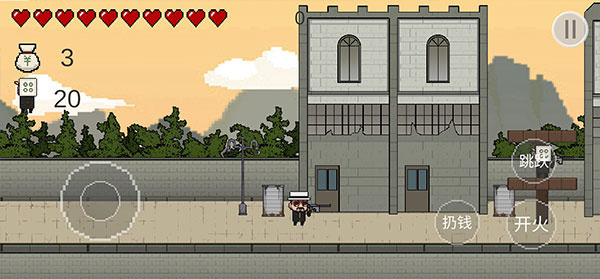3、小编以单摇杆为例,点击进入后,左下角就是控制轮盘,右侧分别是跳跃、开火以及扔钱按钮,左上角显示当前生命值和已获得钱袋、当前关卡的敌人。