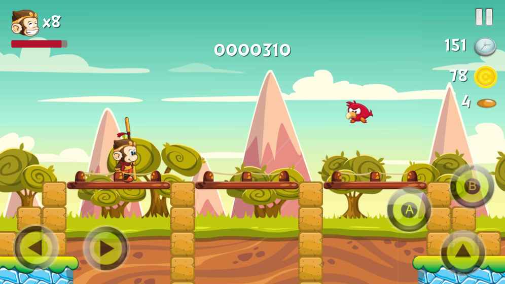 唔,仅有健康可不足以帮助小猴子解决困难哦。每只愤怒的小鸟都有可能叮咬他!运用流畅而简单的移动操作指引小游戏完成冒险。