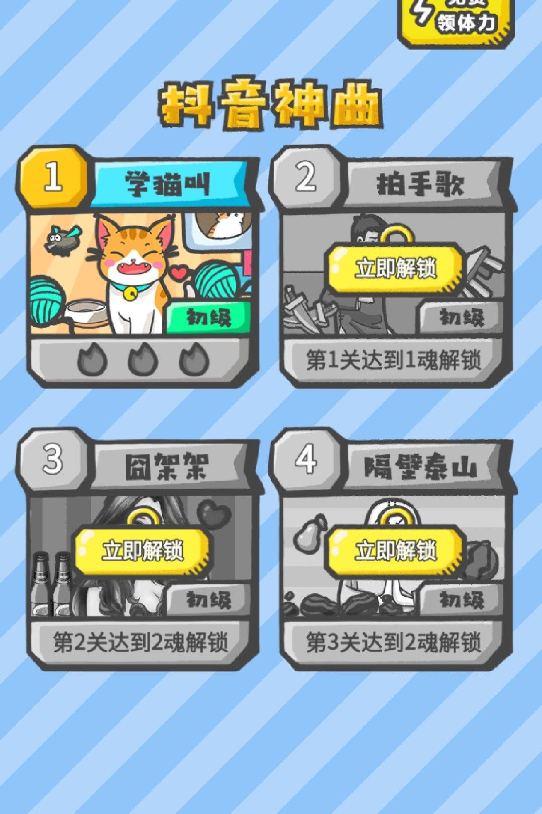1、全新推出的闯关游戏,将抖音神曲跟动作节奏玩法相结合,真的很有趣;