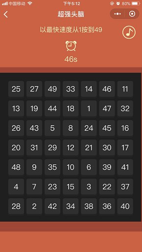 49个数字按照顺序按出来,游戏会不间断的大乱原有的数字。