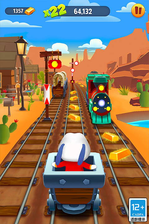 “飞机”或许是游戏里人气值最高的道具了。玩家拾取该道具后,可在一段时间内驾驶飞机翱翔天际,完全不必担心撞上障碍物;同时,飞行路线上还会出现大量金条,只要操作得当,这段“上天”时间就能让你赚得盆满钵满。需要注意的是,飞机的飞行速度比玩家在地面跑酷的速度快很多,如果手速不够快,便可能错过捞金的大好时机。因此,想要成为合格的飞行员,小伙伴们就得努力提升自己的变道技术。