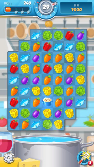 游戏采用关卡闯关的形式进行,通过消除与餐馆经营的融合,让玩家在周游世界的过程中,以三消的方式成就你的大厨梦想。与传统的消除游戏一样,游戏时你需要在规定的步数之内,把三种相同的食材连成横排或者竖排即可进行消除,而且一次性匹配的食材越多,所获得的分数就越高。当你达到规定的分数或者完成特定的消除目标的话,即可闯关成功。只不过你要是追求三星的话,还得多开动脑筋才行。