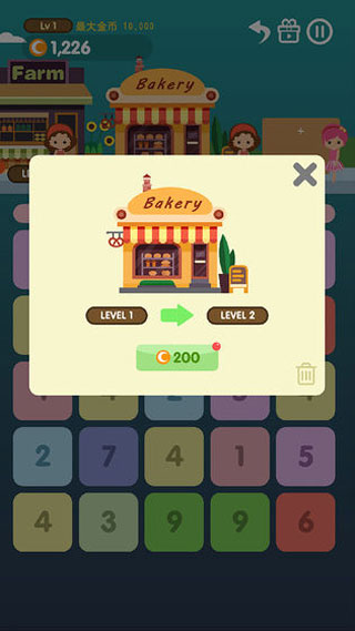 3、合成方块获得金币,可以购买或升级商店,吸引更多的顾客来你的商店街购物。