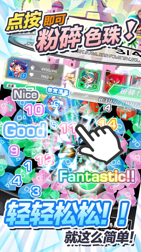 《粉碎狂热》中只要透过点按的简单操作就可以体验到最高级的爽快感,只要1次点按就可以连锁粉碎色珠。超华丽效果的粉碎技能、一发逆转的狂热模式等,多样化的系统让你感受更多的爽快感!