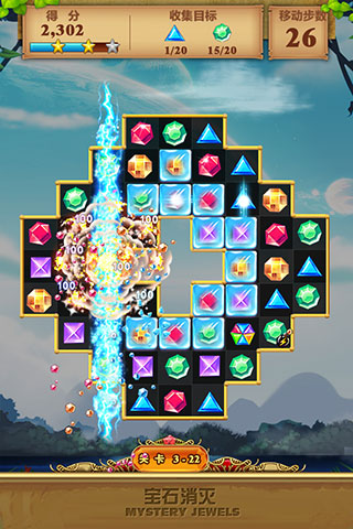 1、匹配3个及以上相同宝石即可消除。2、游戏有不同的道具生成,横向消除、纵向消除、魔法消除以及炸弹消除统统都有!!