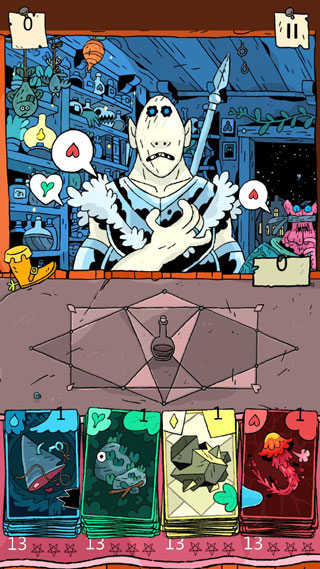 学会制作药水之后,接下来玩家便可开启商店完成营业了,记住来到这里的每个客户都有特殊的订单,其中上面的文字泡泡显示了它想要的药水原料,你必须至少使用1张客户想要的配料卡,否则游戏结束,